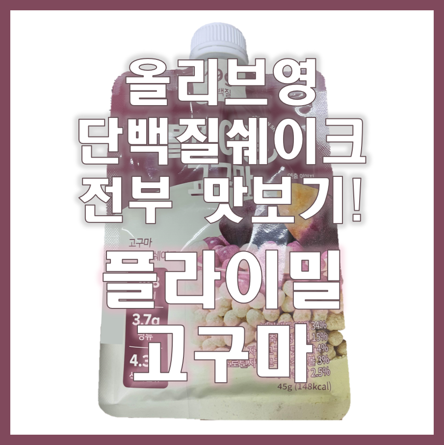 안녕하세요. 카야브라운입니다. 올리브영 단백질쉐이크 전부 맛보기 12탄!오늘은 플라이밀 고구마를 먹어봤습니다.🍠 참고로 저는 매일 아침밥이나 저녁밥을 둘 중 한 번, 즉 하루 한 끼 단백질쉐이크만 먹는 2주 다이어트를 진행했고,엊그제 자로 마무리해서 3.4kg를 감량했습니다.체중 감량된 속도에 비해 그렇게 힘들지 않았기 때문에당분간 좀 더 지속해 볼 예정이에요.💪 포장에 있는 사진이 너무 맛있어 보이지 않나요?2주 정도 체중감량을 하다 보니 조금씩 탄수화물이 당기기 시작하는데요..!제 마음을 끄는 저 달달해 보이는 그림~플라이밀 블랙(흑임자)도 물에 타먹었을 때 맛있었기 때문에고구마 맛도 상당히 기대가 됩니다. 플라이밀 고구마 파우치 1개의 칼로리는 148kcal, 당류는 3.7g으로 다른..